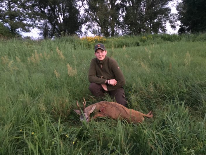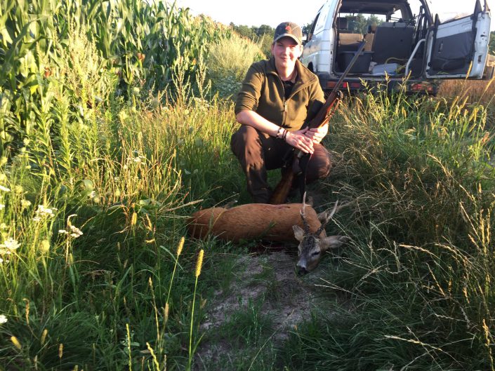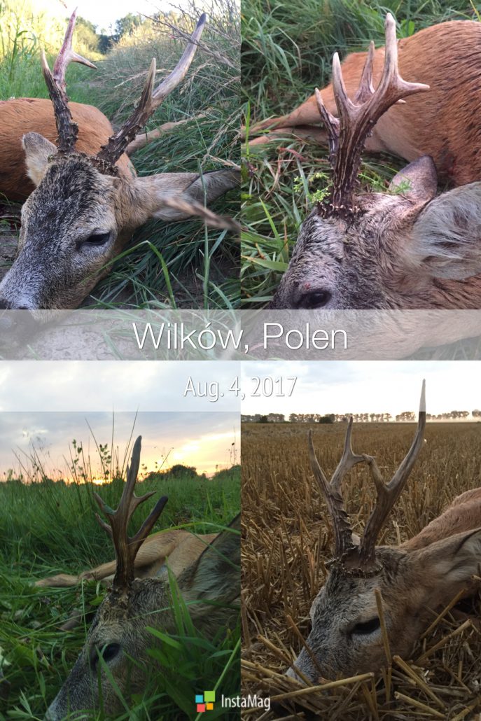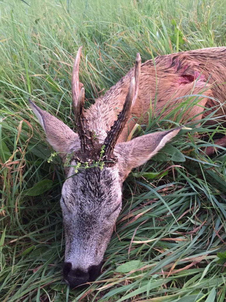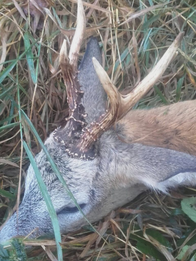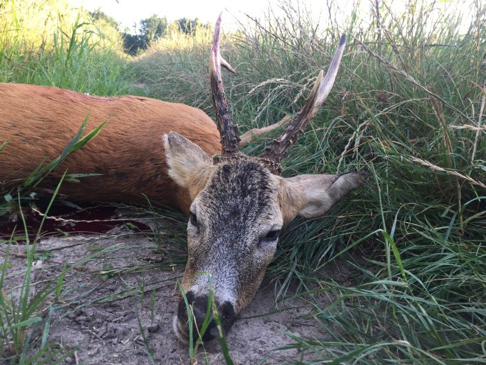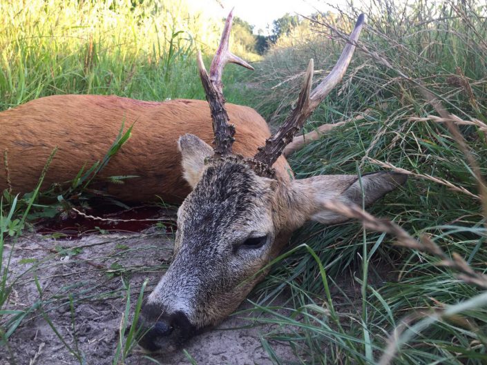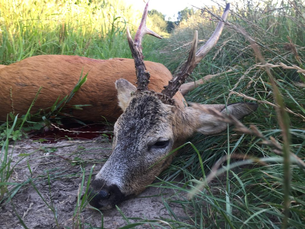 Anfang August ging es mit 3 Jagdkollegen nach Polen zur Blattjagd. Nach lustiger Fahrt gut angekommen, wurden wir von unseren Jagdführern begrüßt. Nach kurzer Lagebesprechung ging es für uns in die Reviere. Der erste Bock ließ nicht lang auf sich warten. Nach kurzer Pirsch und sicherem ansprechen, war ich mir sicher der Bock sollte es sein, leider bekam er Wind und sprang ab. Ich sagte zu meinem Führer, wir schauen morgen früh nach diesem Bock. Auf dem Rückweg, sah ich einen starken Sechser im Getreide, diesen pirschten wir vorsichtig an. Als alles passte, legte ich meine Waffe auf den Pirschstock, als der Bock breit stand ließ ich fliegen, nach kurzer Flucht lag der Bock.