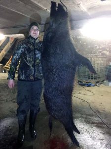 Ich nahm mein Glas hoch um mich umzusehen, da traute ich meinen Augen kaum, links von mir in einer Wiese stand ein Stück Schwarzwild. Ich griff sofort zur Waffe, legte an, ein letzter Blick durchs Glas ob noch mehr dabei sind, keine Spur, es war ein einzelnes Stück, dann brach der Schuß aus der R93 im Kaliber 6,5 x 65. Der Schwarzkittel legte sich in Zeitlupe auf die Schwarte, schnell repetiert und weiter beobachtete ich das Stück, mein Herz raste (hoffentlich ist alles richtig dachte ich mir). Durchs Glas konnte ich erkennen, das das Stück keine Bewegung mehr von sich gab. Einmal tief durchatmen und der Griff zum Handy. „Andi du musst kommen, ich habe ein Stück Schwarzwild erlegt, er fragte wie schwer, meine Antwort, puh ja so ca.70kg glaube ich“. Es dauerte keine 10 Minuten und er war da.
